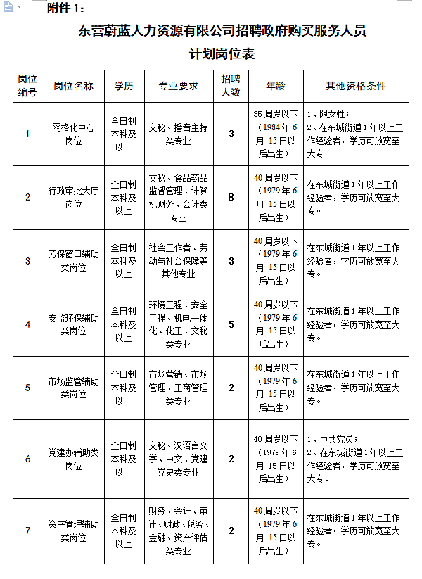 附件1 東營(yíng)蔚藍(lán)人力資源有限公司招聘政府購(gòu)買服務(wù)人員計(jì)劃崗位表.docx